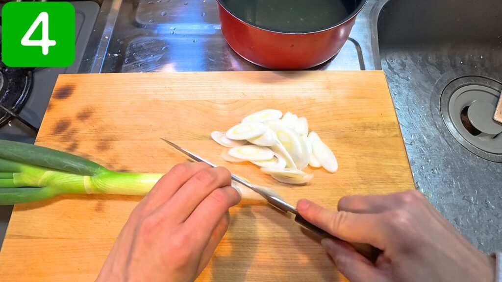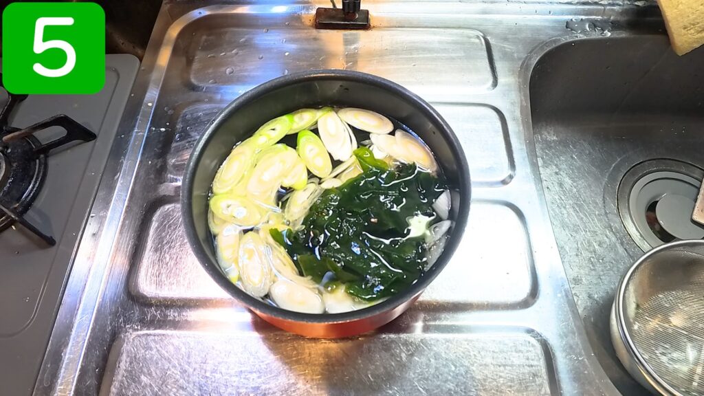 4の工程で切ったねぎ、戻したわかめを出汁に入れます。
