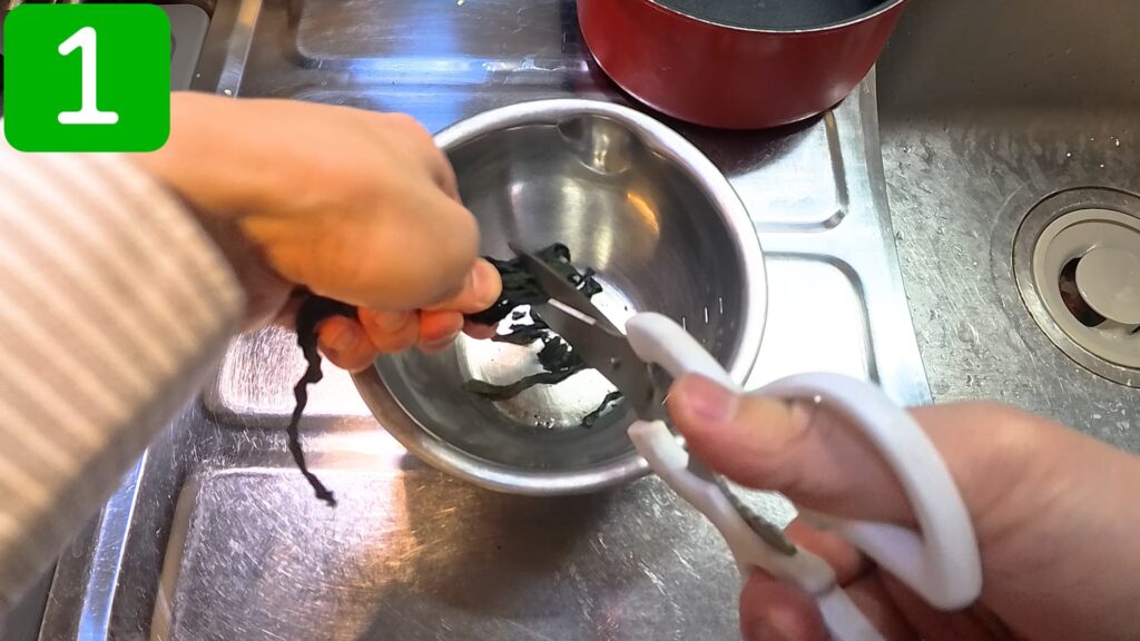 乾燥わかめは、味噌汁にちょうど良いサイズにカットしておきます。