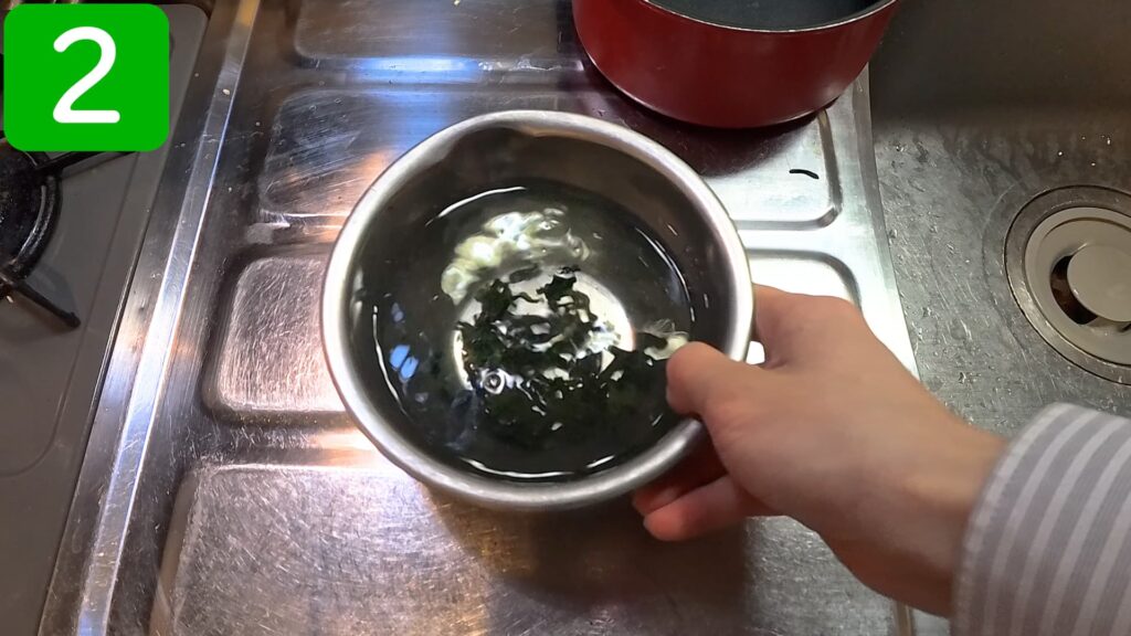 たっぷりの水を張って、わかめは十分に戻しておきます。