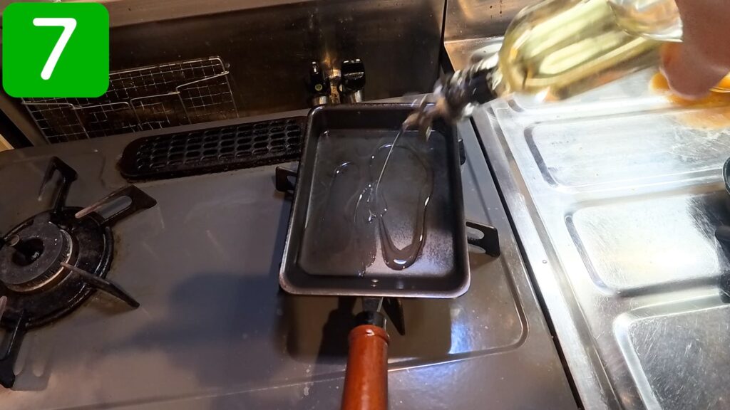 卵焼きフライパンを火にかけ、油を敷きます