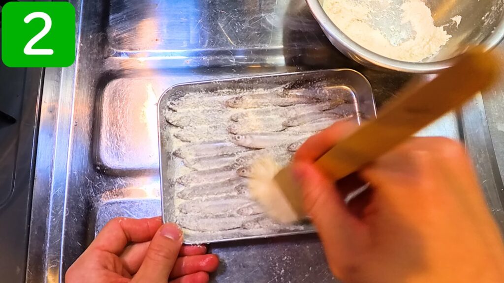 衣をまといやすくなるように、水気を切ったワカサギに打ち粉をしておきます。