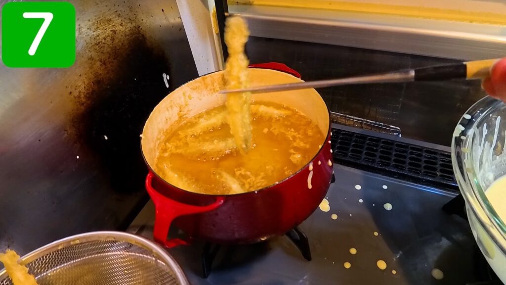 こうすることで、より沢山の衣が付き、華やかな見た目の天ぷらになります。