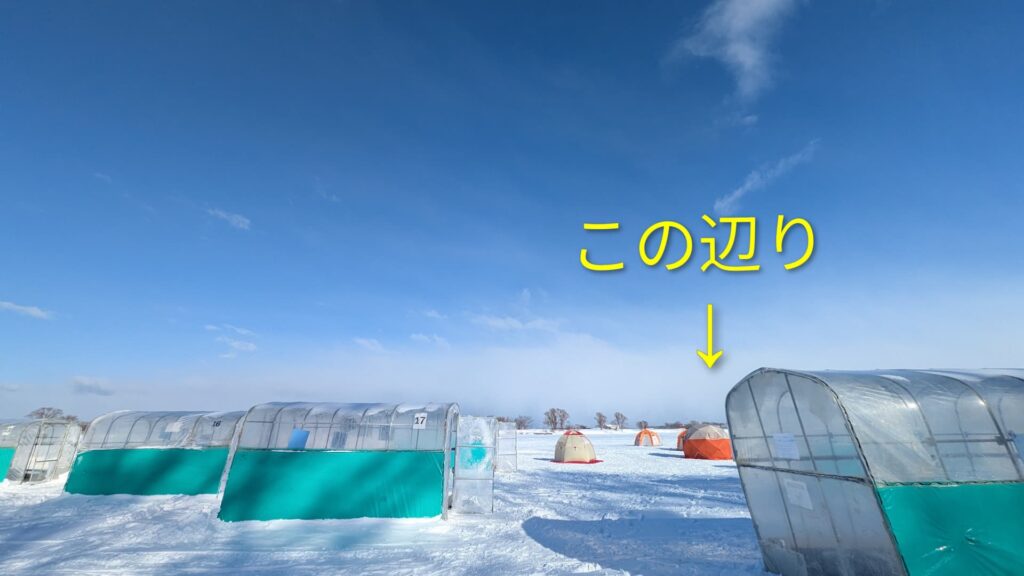 受付の建物から降りて少し右(東)側、常設の小屋奥での釣行です。