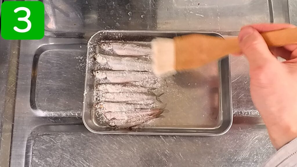衣をまといやすくなるように、ワカサギに薄力粉で打ち粉をしておきます。