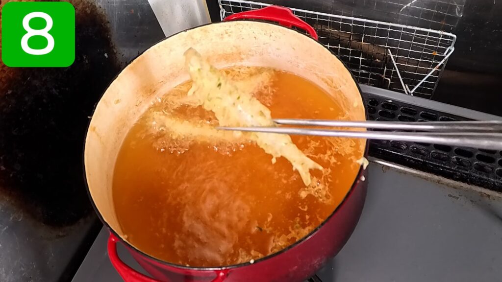 水の温度が高いとグルテンが生成されやすくなり、サクサク感が弱くなる可能性があるため、水はよく冷えたものを使用します。