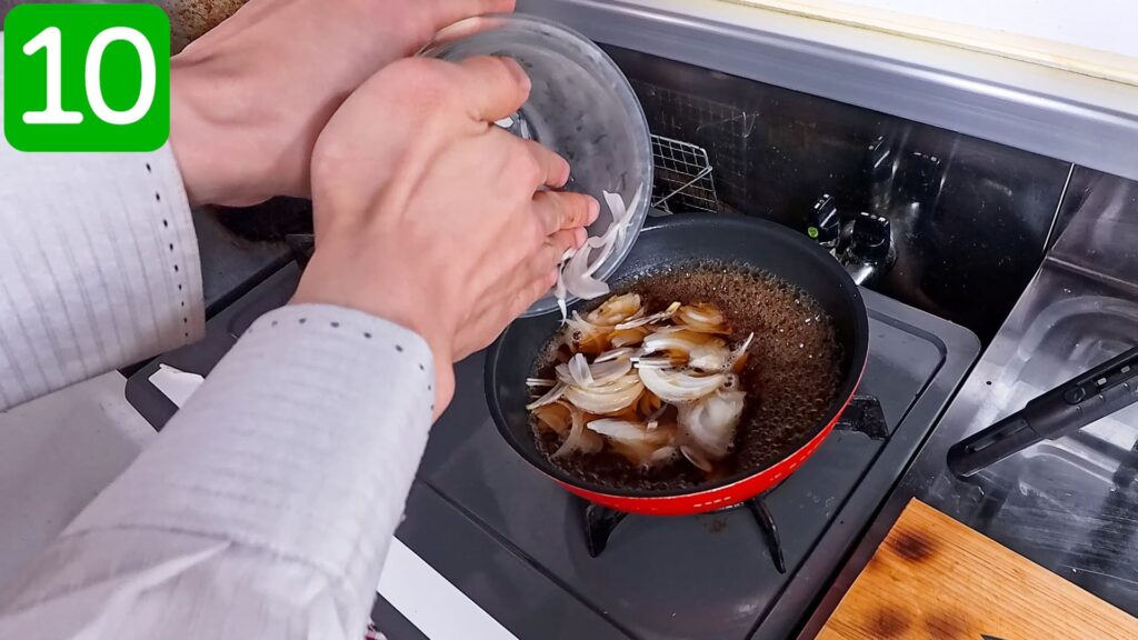 合わせ出汁が湧いたらスライスした玉ねぎを入れます。