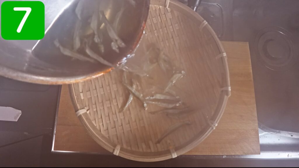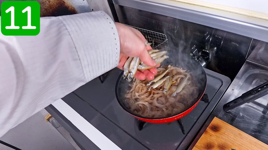 火を弱め、ワカサギを重ならないように入れます。