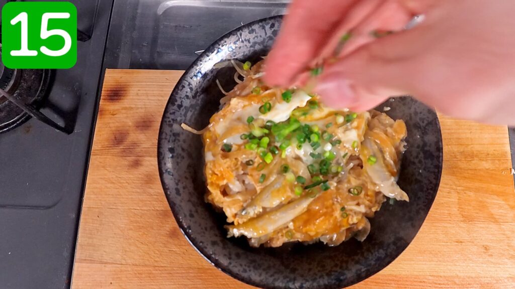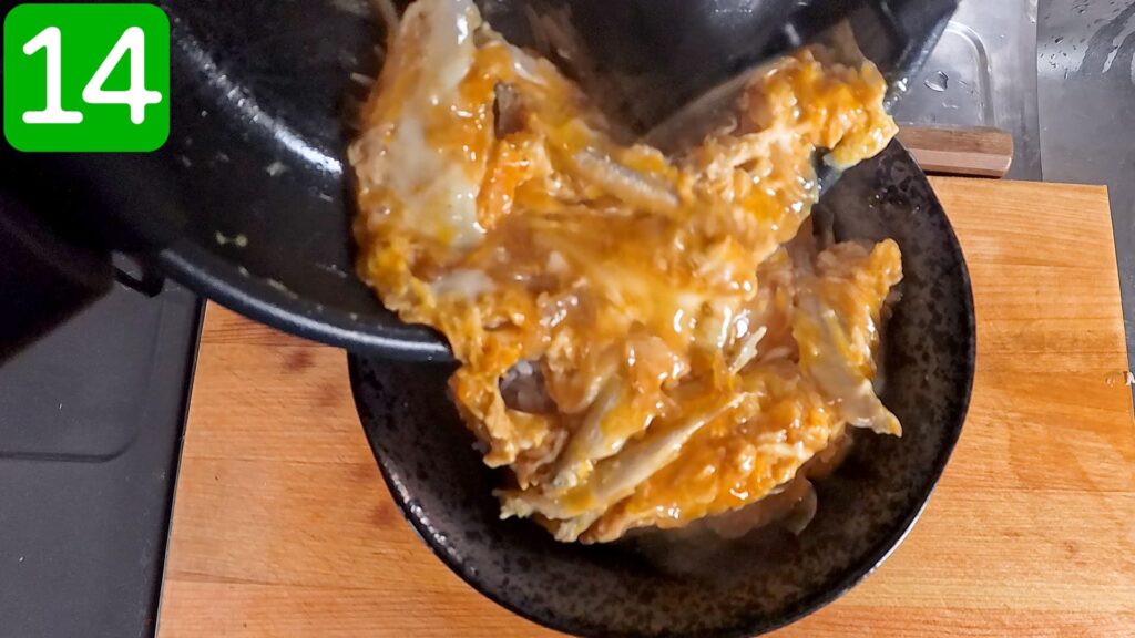半熟に仕上げた卵とじを、ご飯の上に乗せます。