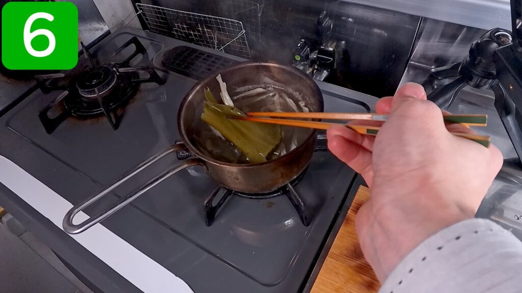 水に浸けていた昆布、煮干しを火にかけ、沸く前に昆布を引き揚げます。