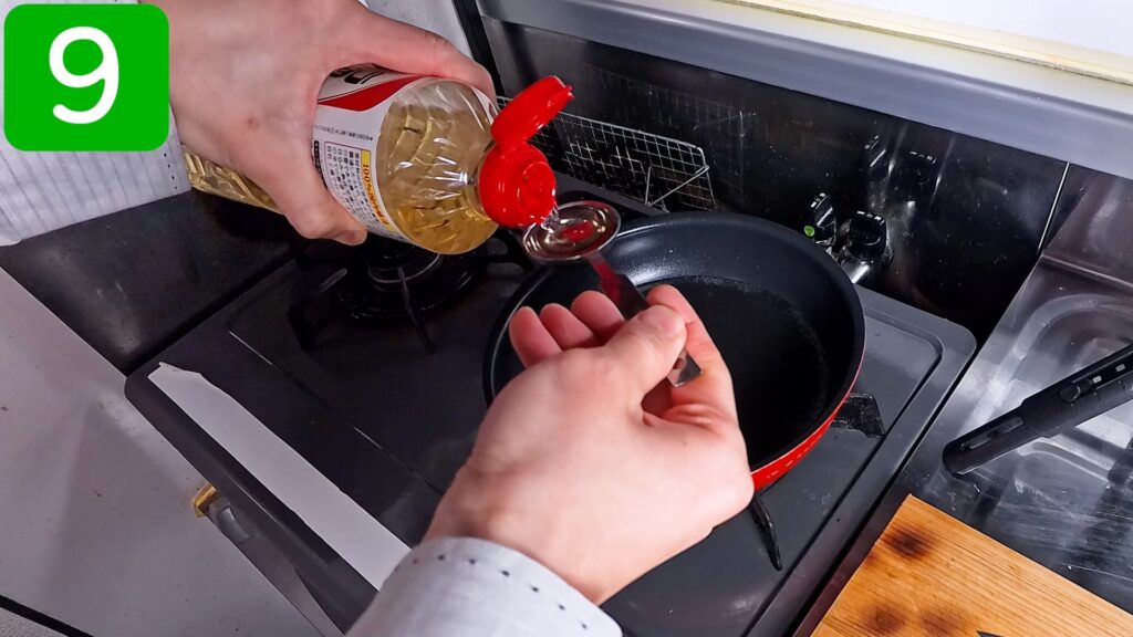 フライパンに卵を流しいれます。