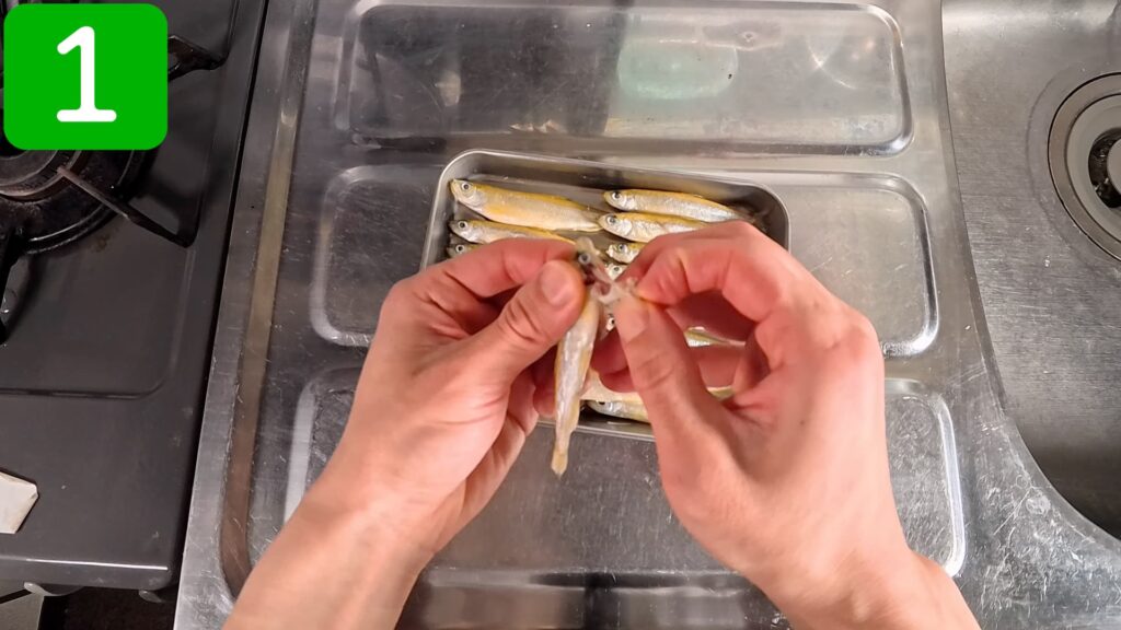 ワカサギの下処理を行います。