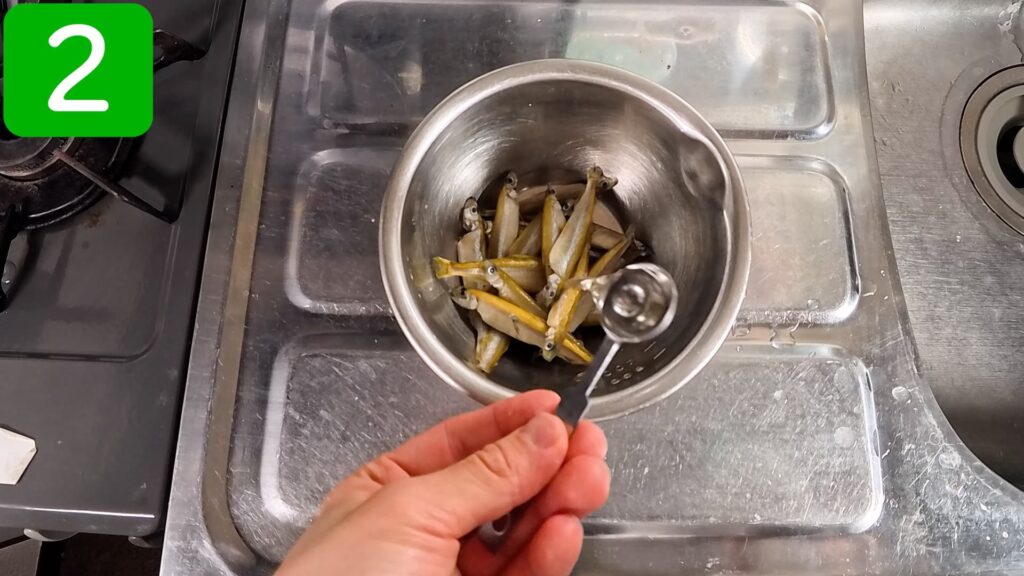 内臓を処理したワカサギに、分量の酒、塩を加えます。