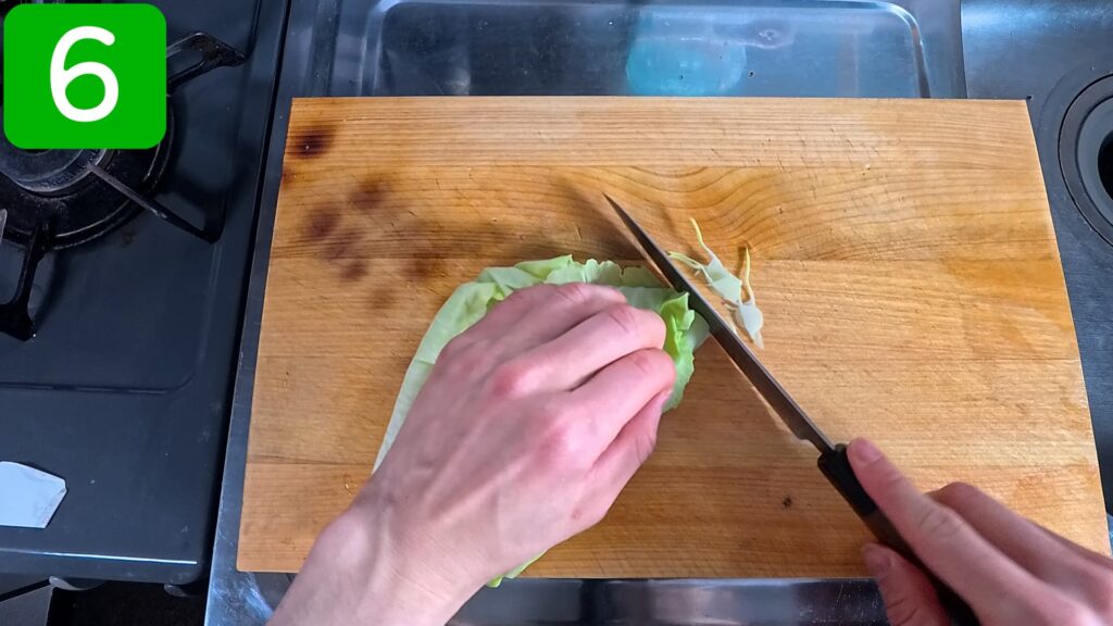 盛り付けの際に使用するキャベツ(分量外)を千切りしておきます。