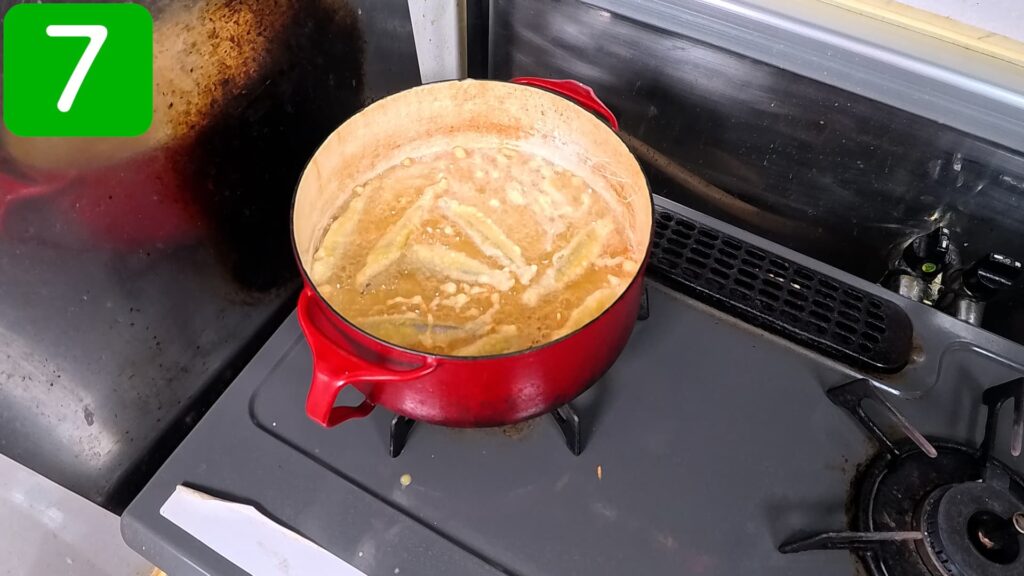 ワカサギに、5で作った衣をしっかりまとわせ、180度の油で2~3分揚げていきます。