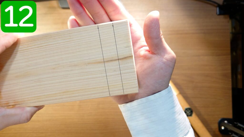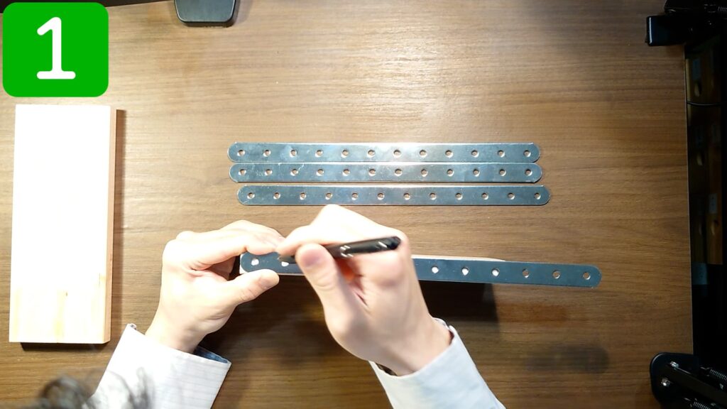 天板となる板の長手方向側の側面に、取り付け金具の端が合うように、印をつけます。