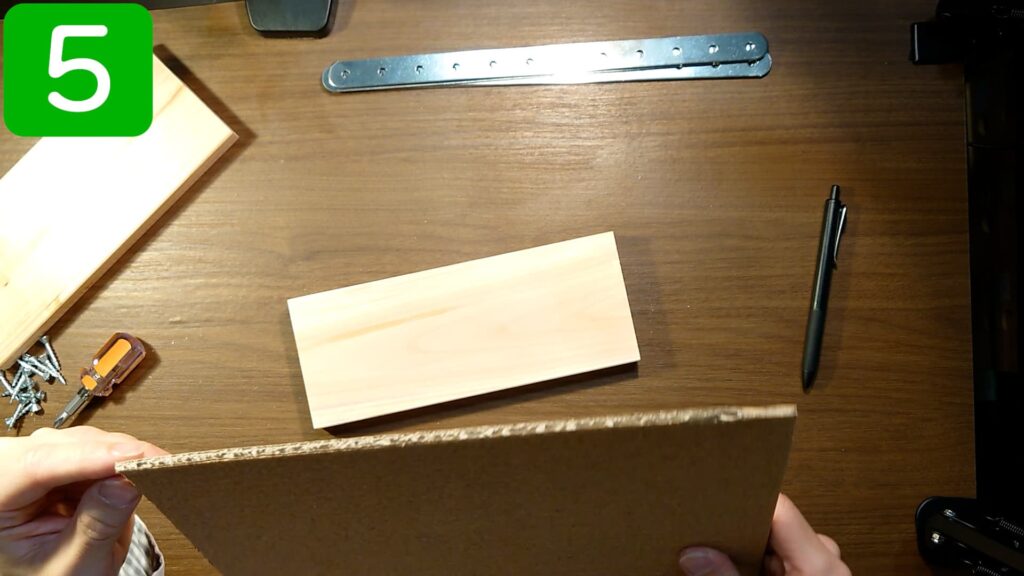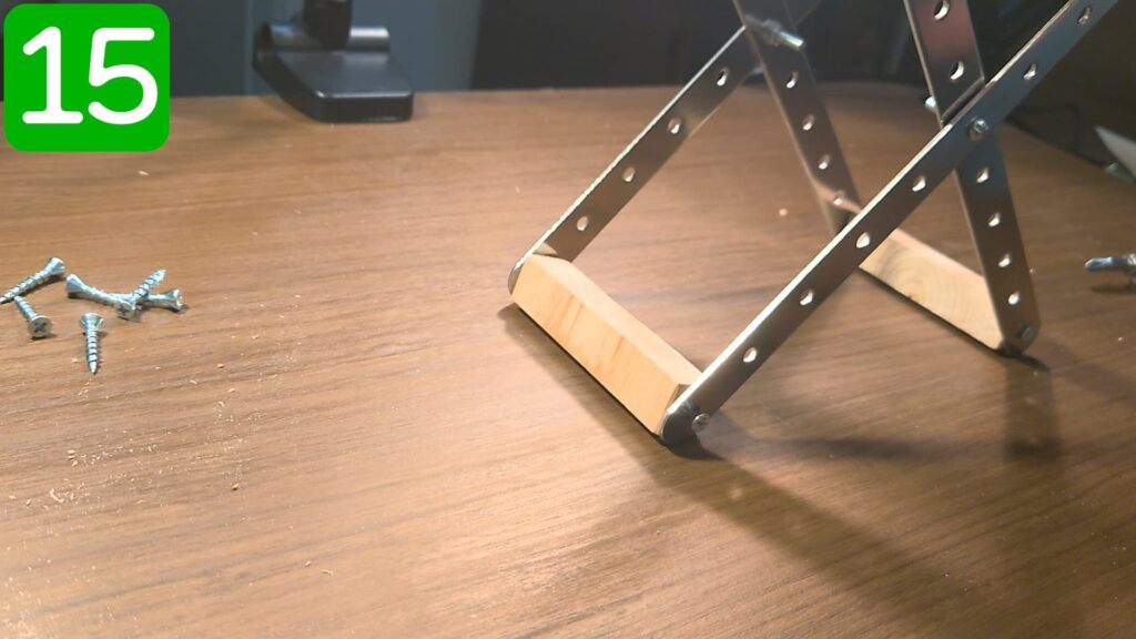 取付金具の下側になる部分に、手順13で用意した木材をビスで留めます。