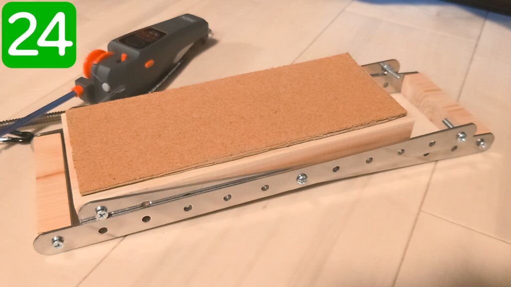 手順1で印をつけた天板の天面側に、接着剤でコルク(段ボール)を貼り付けます。