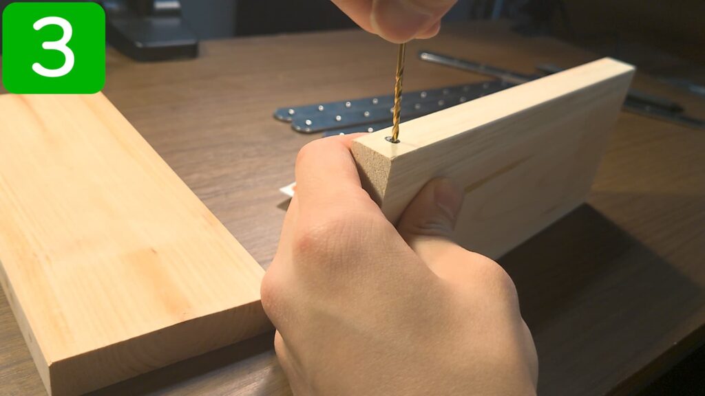 ビスを直接打ってしまうと木が割れるので、先に穴をあけておきます。