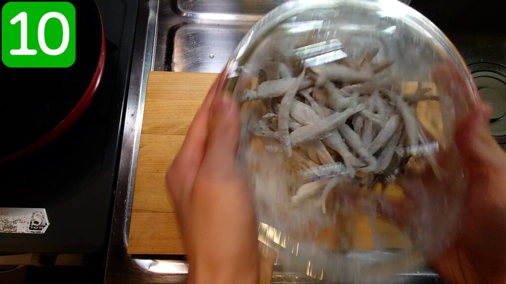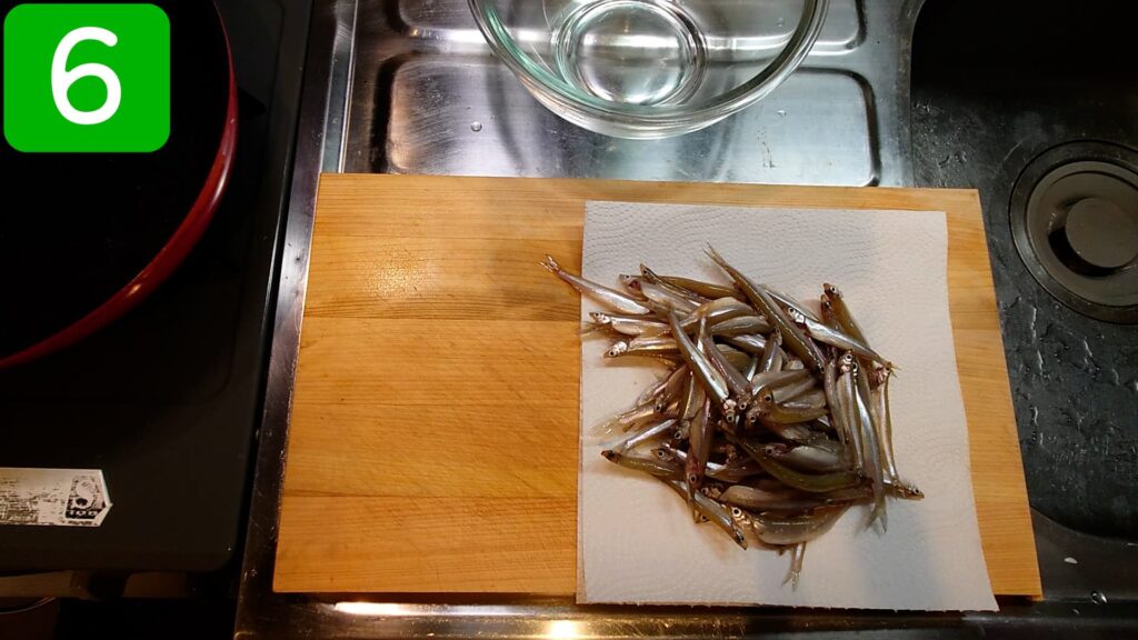 水道水で洗ったワカサギの水気を、キッチンペーパーでしっかり取っておきます。