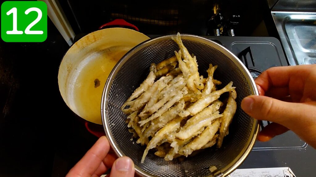 ワカサギは小さいので、2分くらい揚げればOKです。