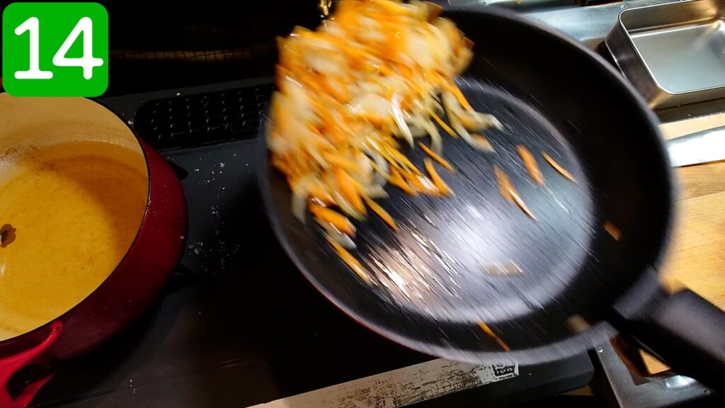 人参と玉ねぎを激しく炒めます。