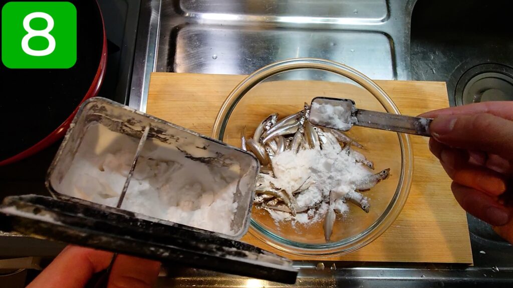 水気をよく拭いたワカサギをボウルに入れ、片栗粉を加えます。