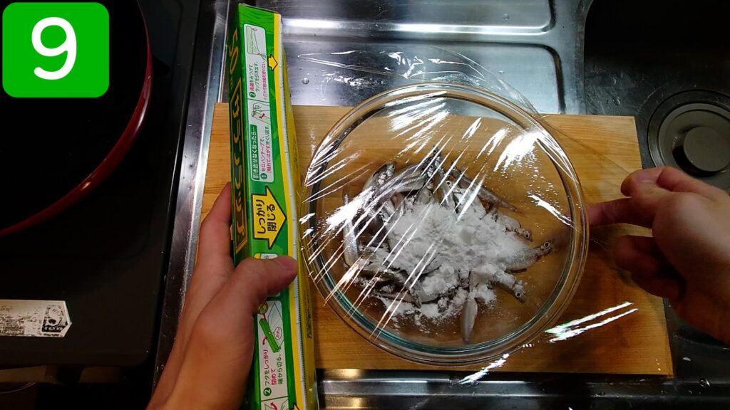 ワカサギ、片栗粉を入れたボウルにラップをピタっとかけます。