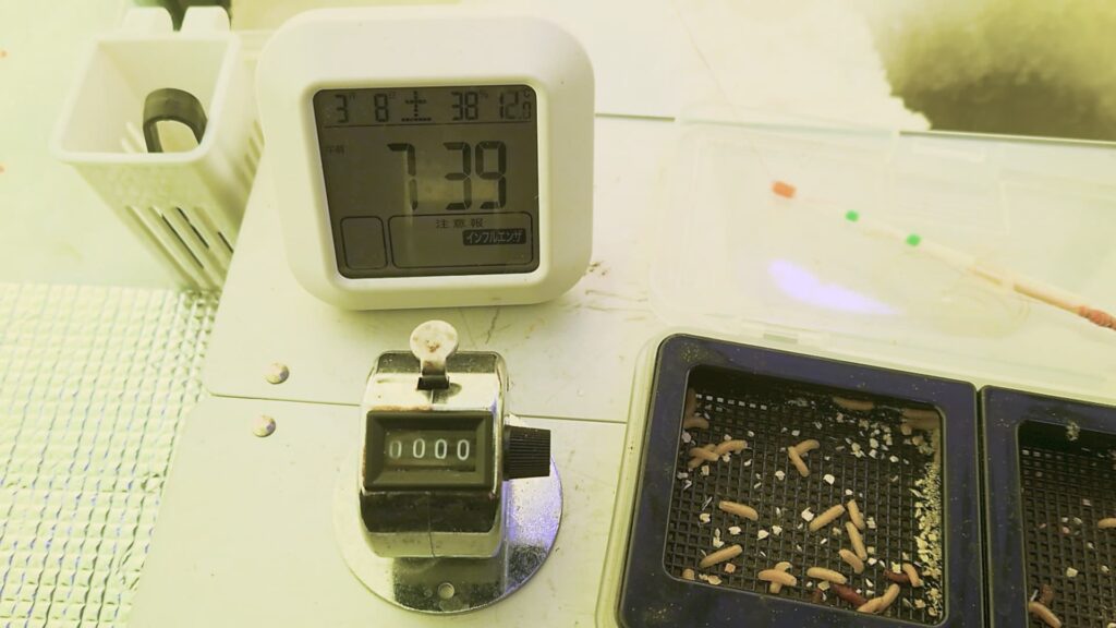 おもりは3gを使用、餌は赤白サシを使用します。