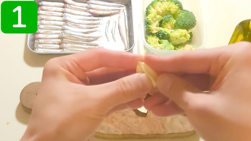 にんにくの皮を剥き、縦半分に切って芽を取ります。